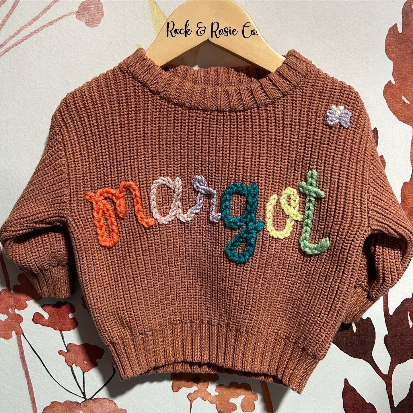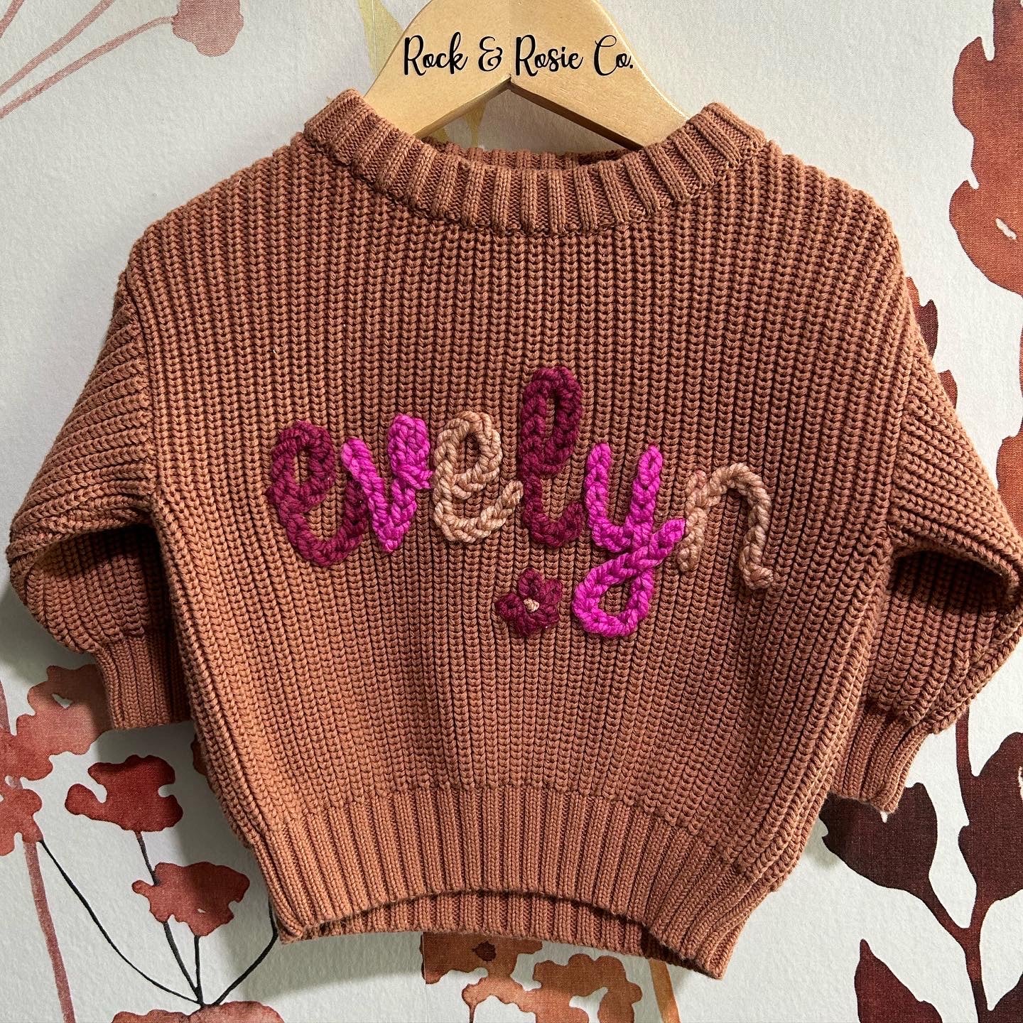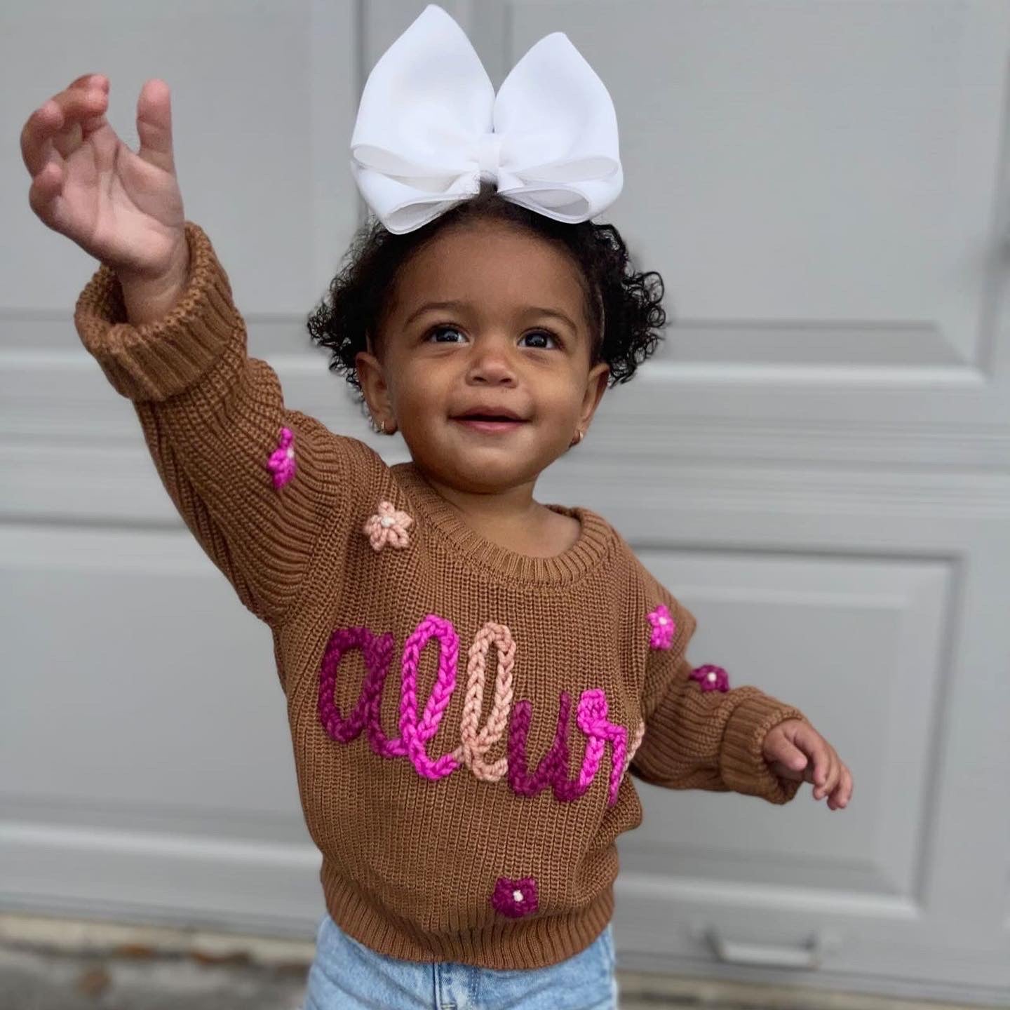 A personalizable, custom made to order hand embroidered sweater, in the sand color! Oversized, and adorable on any baby!