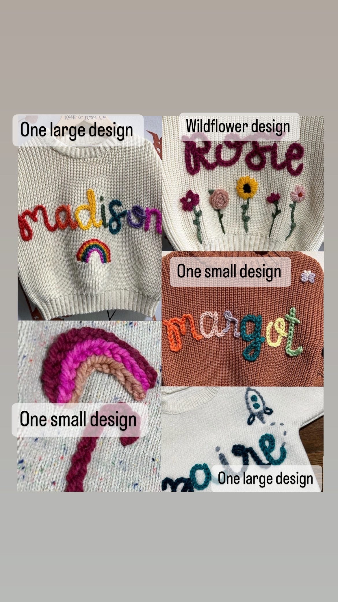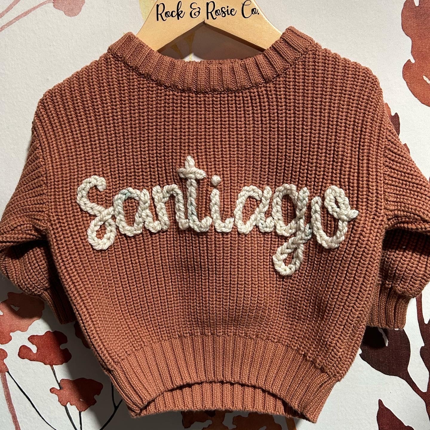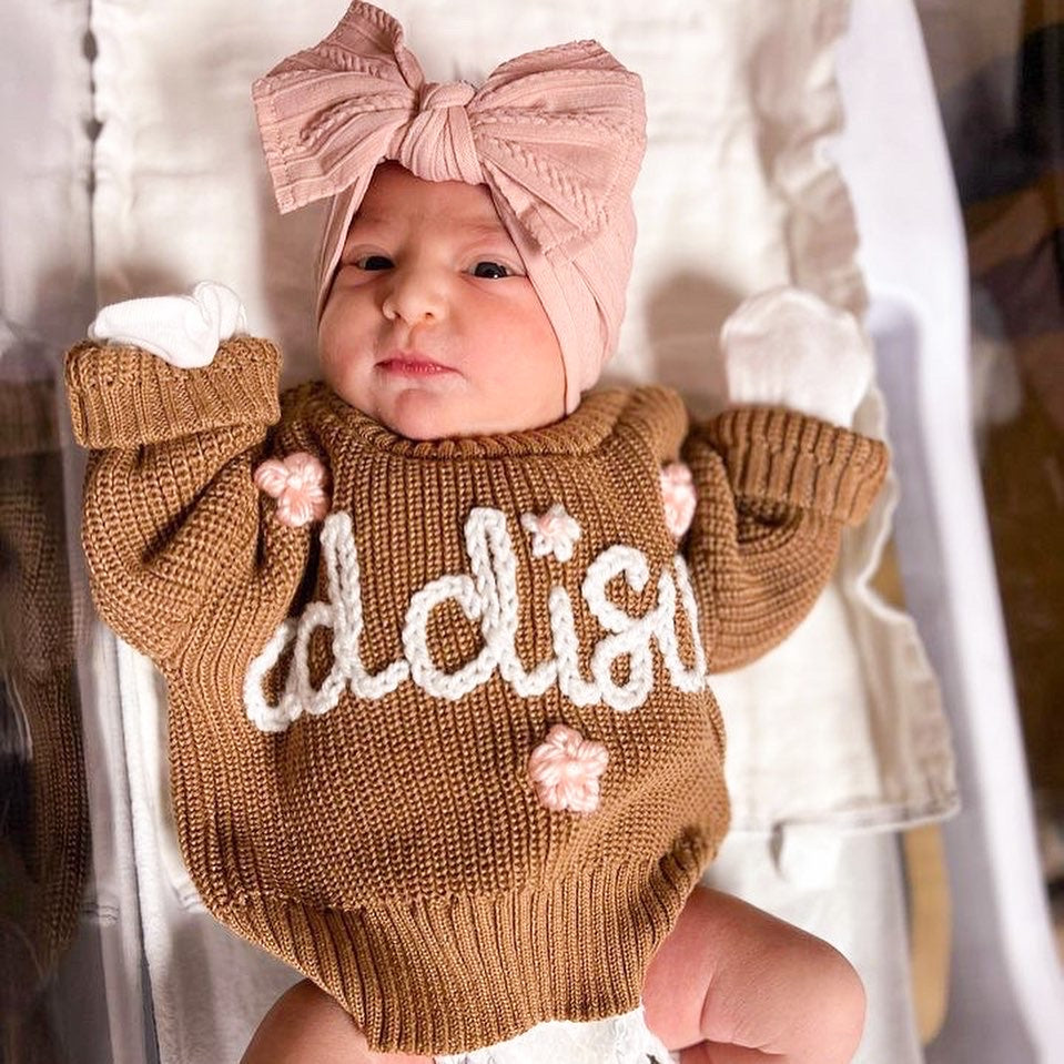 A personalizable, custom made to order hand embroidered sweater, in the sand color! Oversized, and adorable on any baby!